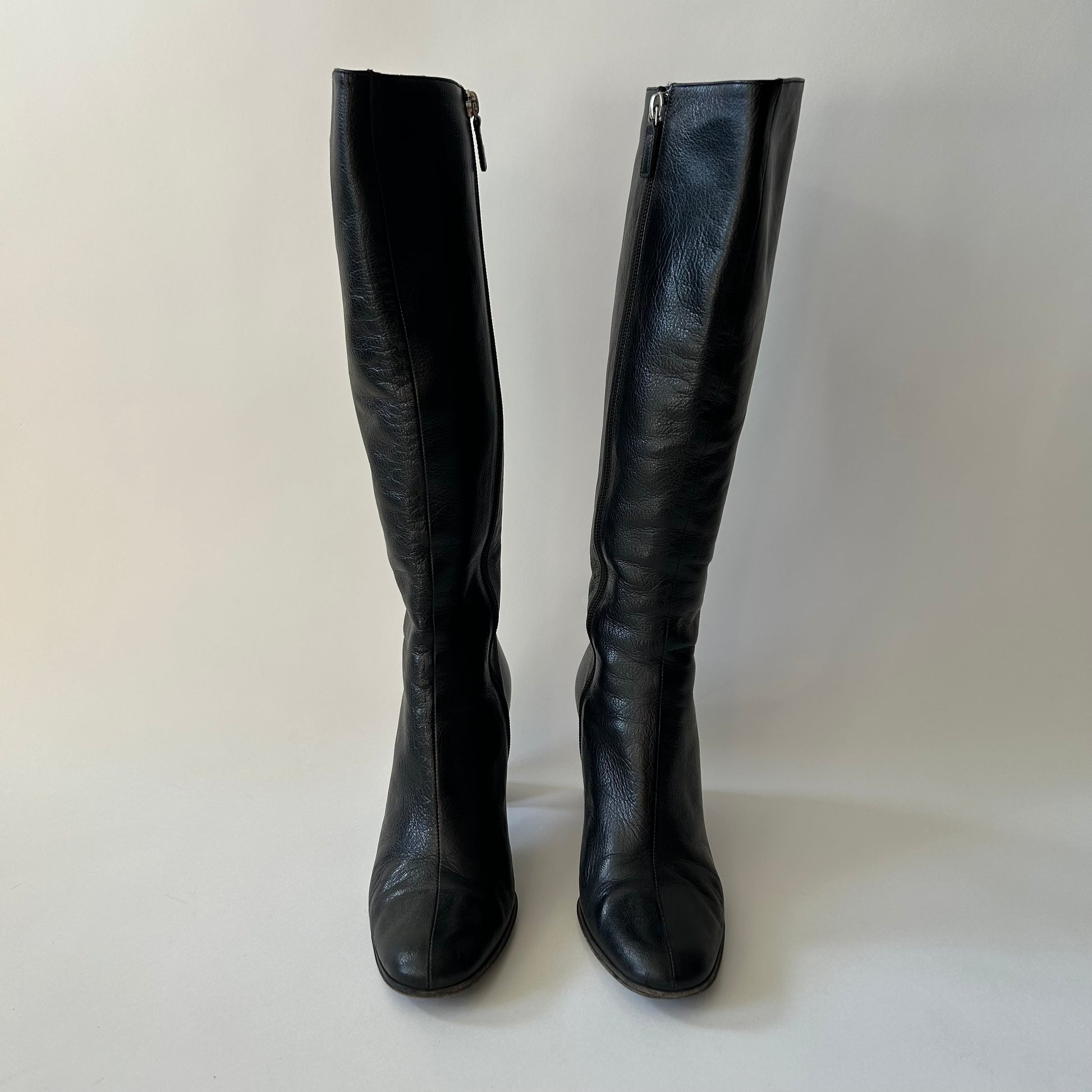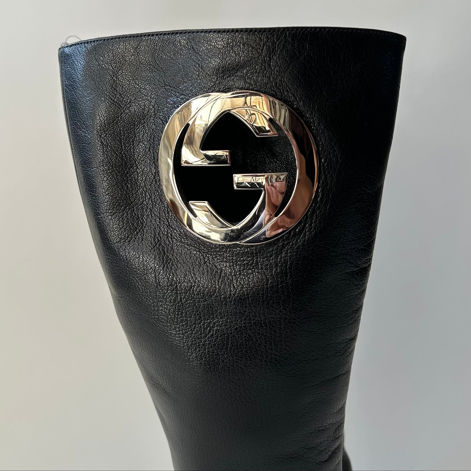 Tom Ford’s Gucci pair of knee-high leather boots, circa 1999. In a sleek silhouette, these vintage Gucci boots are crafted in black lamb supple leather, finished with a block heel, side zipper and a prominent monogram in silver tones on only one boot.