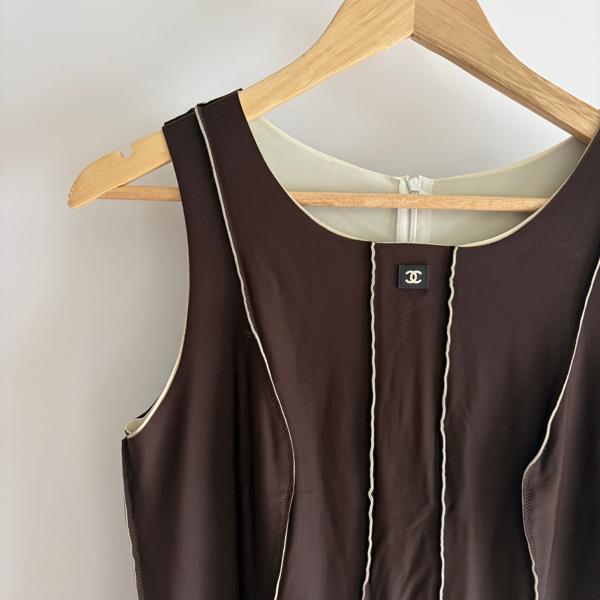 Chanel Spring Summer 1999 brown coco mark CC logo neoprene dress. As seen on Hailey Bieber when she was in Japan with Justin Bieber.