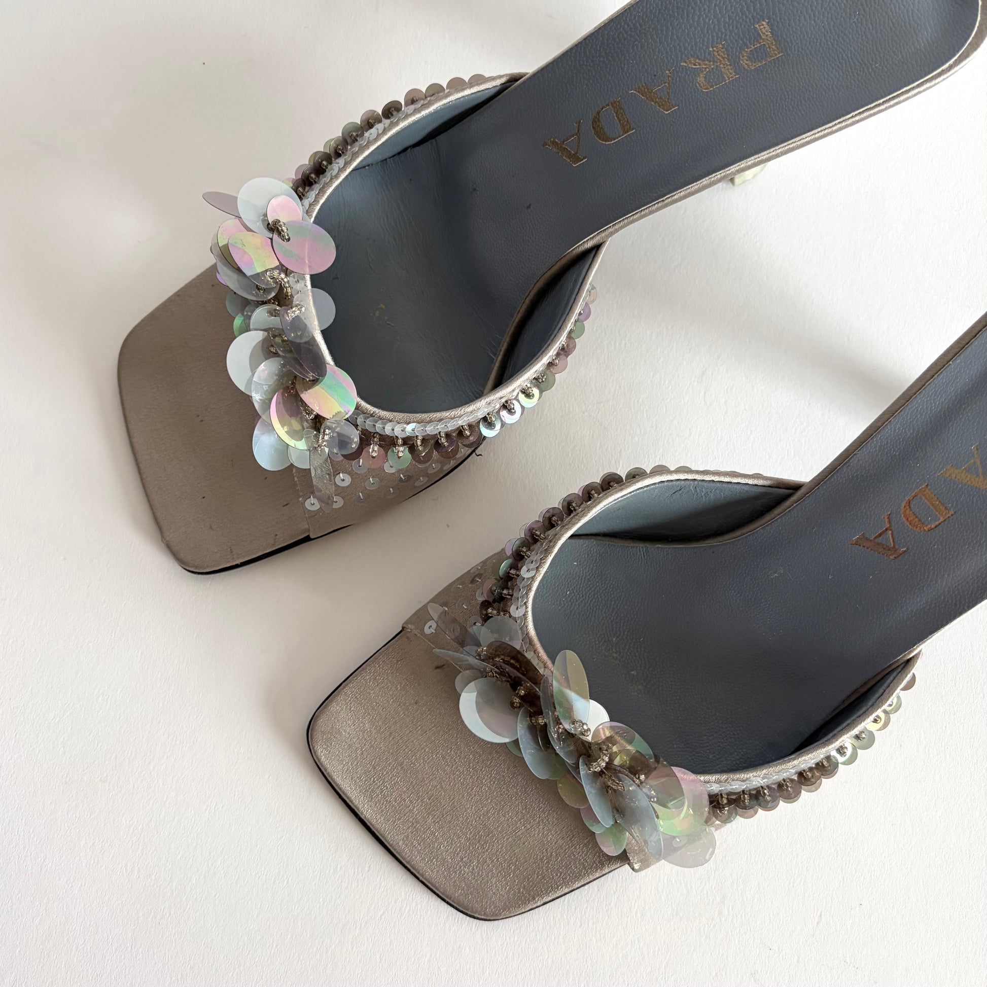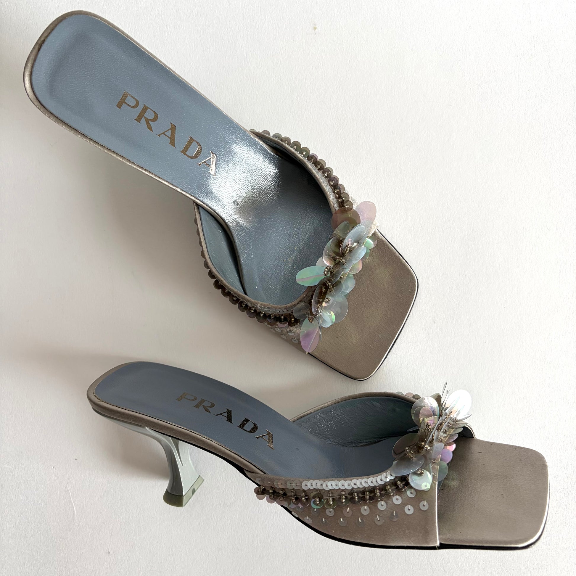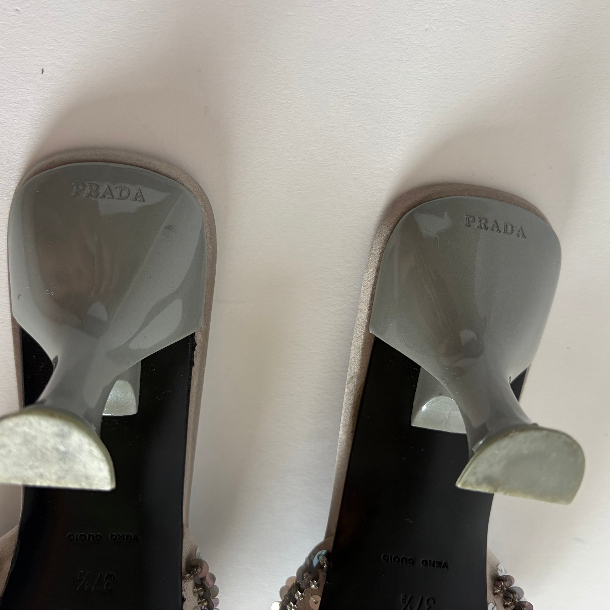 PRADA SATIN SQUARE TOE SEQUIN KITTEN HEELS